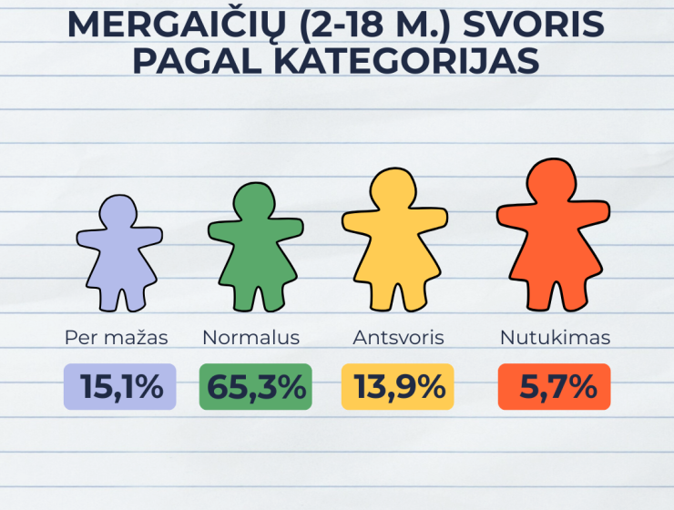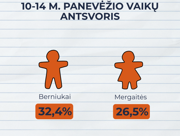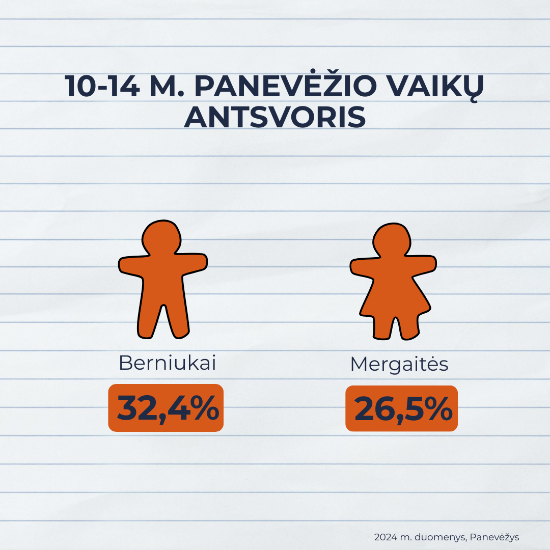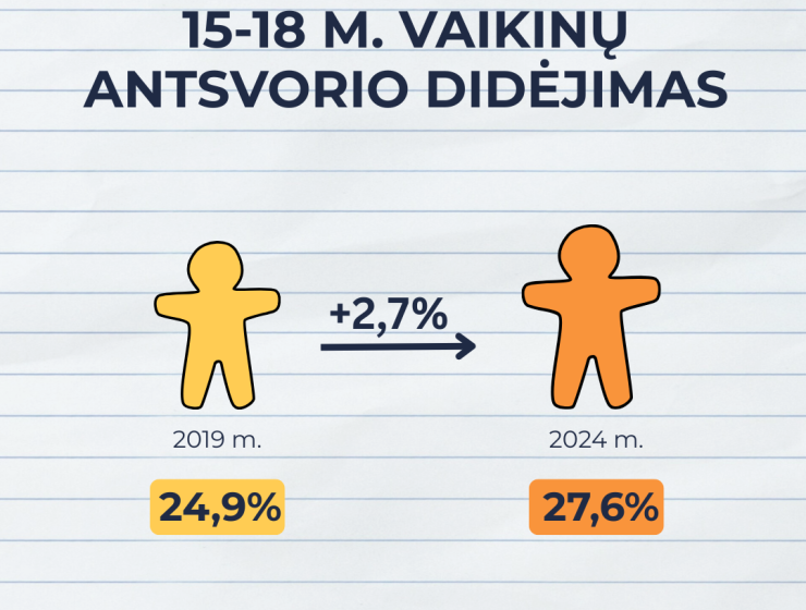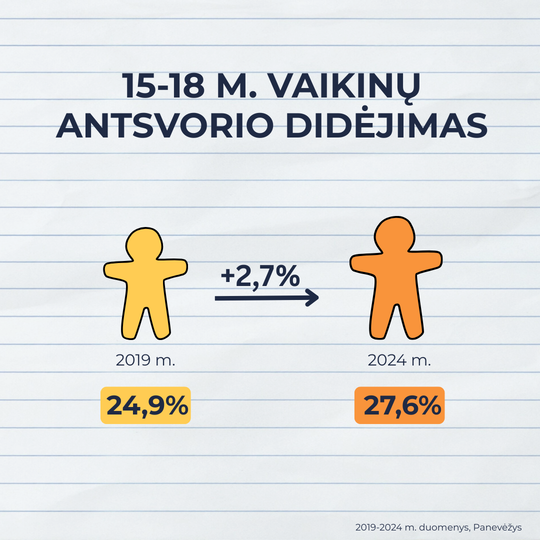 Lyginant 2019 ir 2024 metų duomenis, 10–14 metų berniukų per didelio svorio (antsvorio ir nutukimo) dalis išaugo nuo 31 proc. iki 32,4 proc., o 15–18 metų amžiaus grupėje — nuo 24,9 proc. iki 27,6 proc. Tuo tarpu mergaičių grupėje fiksuojamos priešingos tendencijos: 10–14 metų grupėje per didelio svorio dalis sumažėjo nuo 27,1 proc. iki 26,5 proc., o 15–18 metų grupėje — nuo 20,6 proc. iki 19,5 proc.