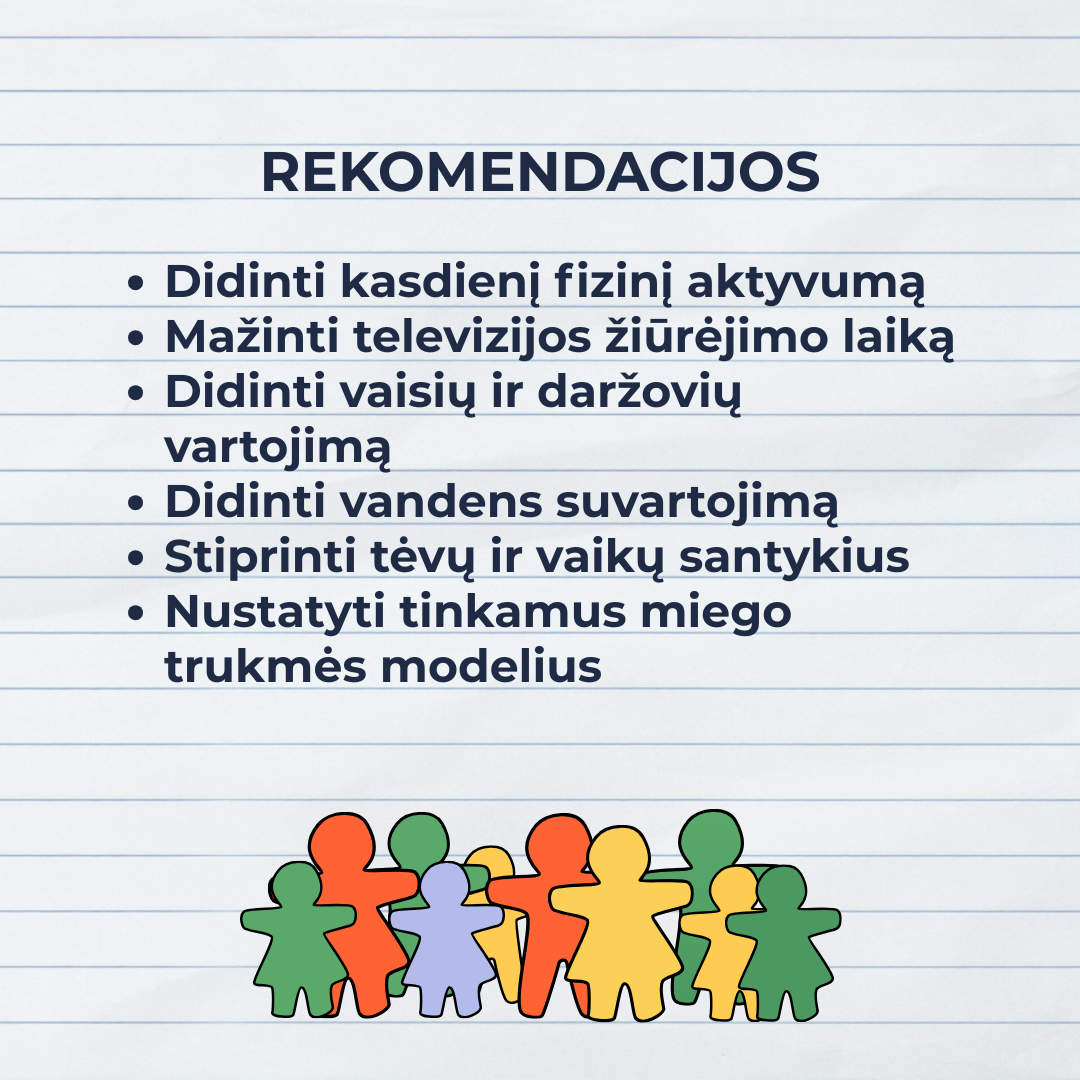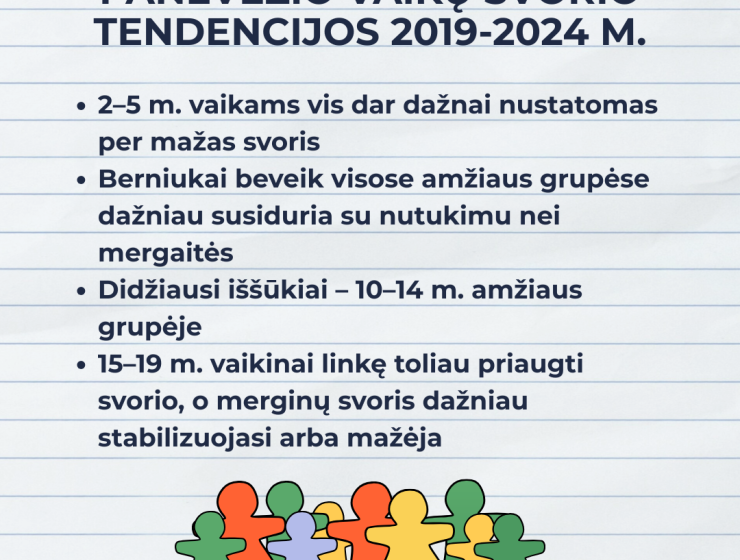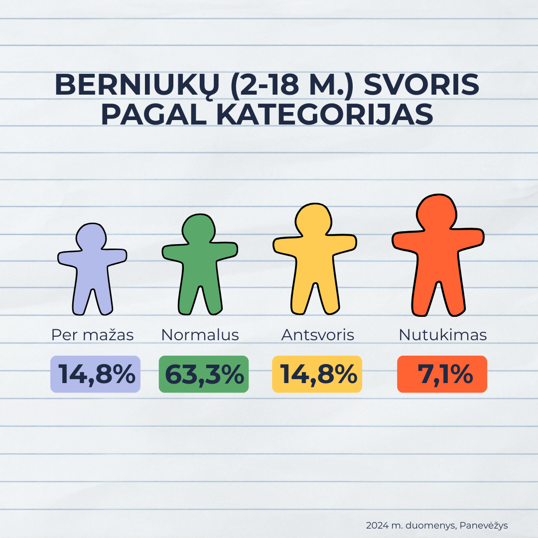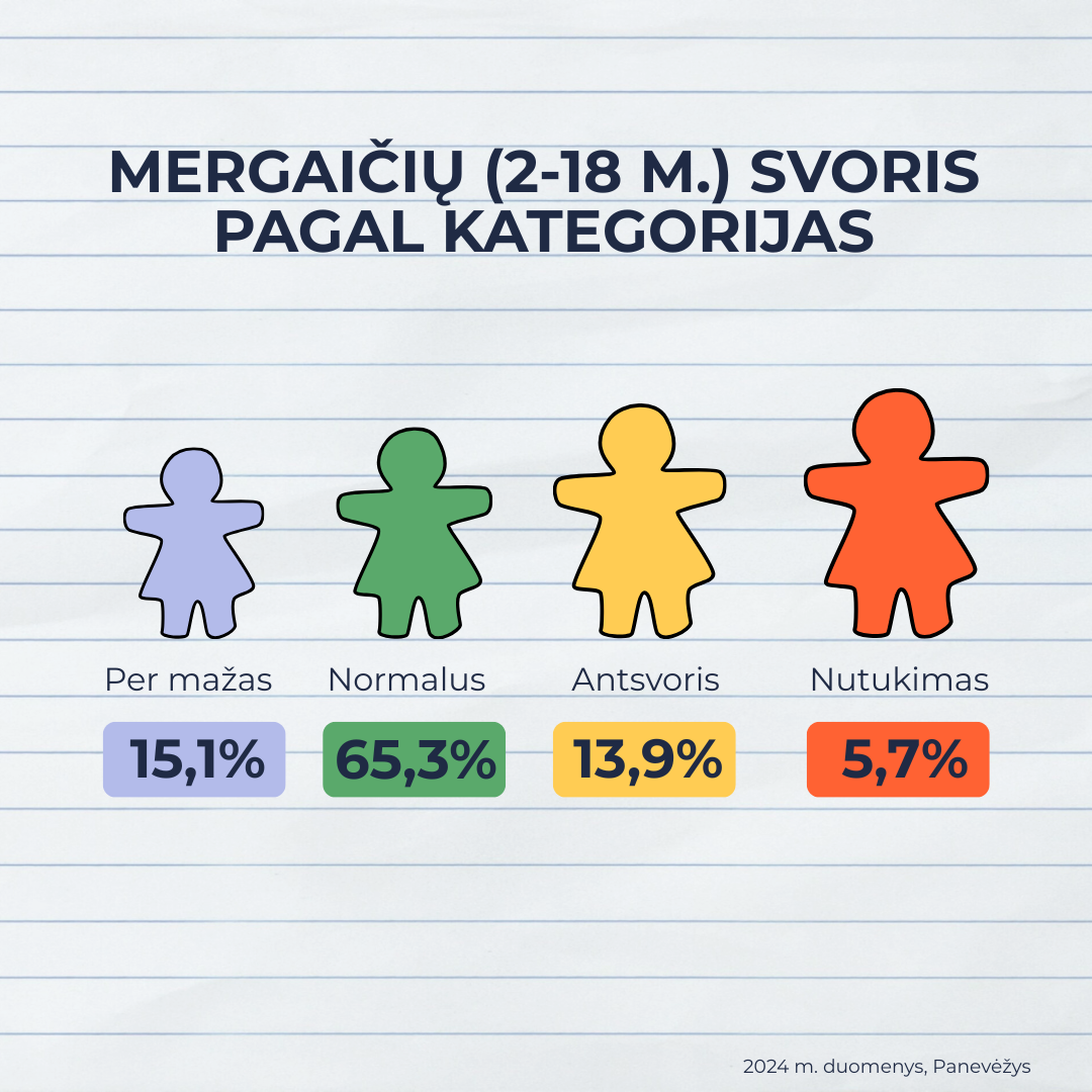Lyginant 2019 ir 2024 metų duomenis, 10–14 metų berniukų per didelio svorio (antsvorio ir nutukimo) dalis išaugo nuo 31 proc. iki 32,4 proc., o 15–18 metų amžiaus grupėje — nuo 24,9 proc. iki 27,6 proc. Tuo tarpu mergaičių grupėje fiksuojamos priešingos tendencijos: 10–14 metų grupėje per didelio svorio dalis sumažėjo nuo 27,1 proc. iki 26,5 proc., o 15–18 metų grupėje — nuo 20,6 proc. iki 19,5 proc.