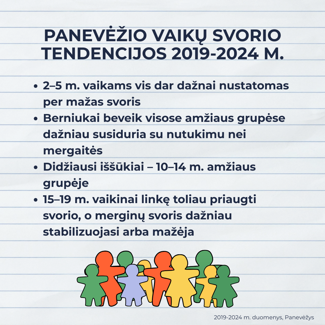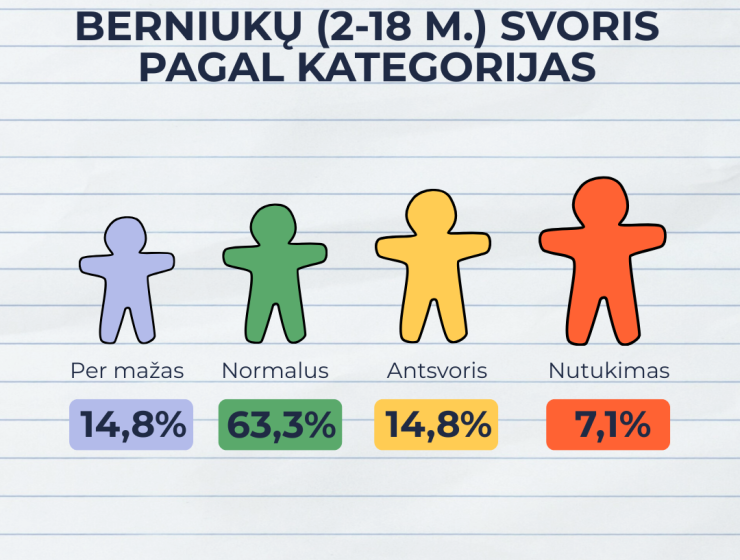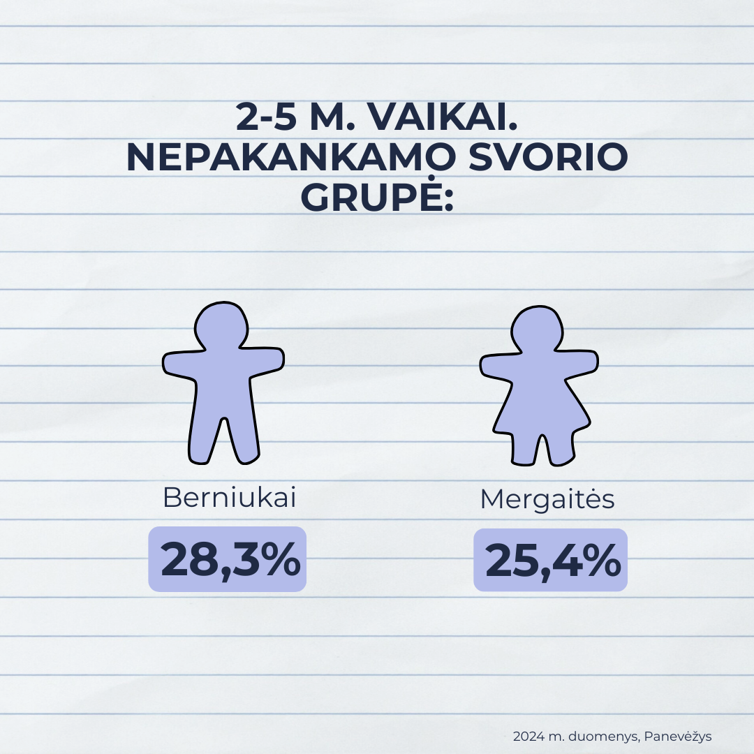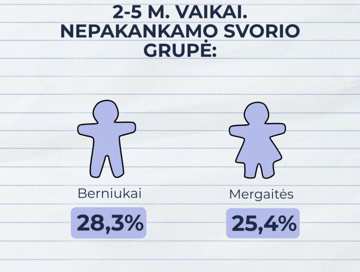 Rezultatai parodė, jog svorio tendencijos išlieka panašios. 2–5 metų amžiaus grupėje daugiau nei ketvirtadalis vaikų susiduria su per mažo svorio problema — 28,3 proc. berniukų ir 25,4 proc. mergaičių — kuri per penkerius metus dar labiau išryškėjo.