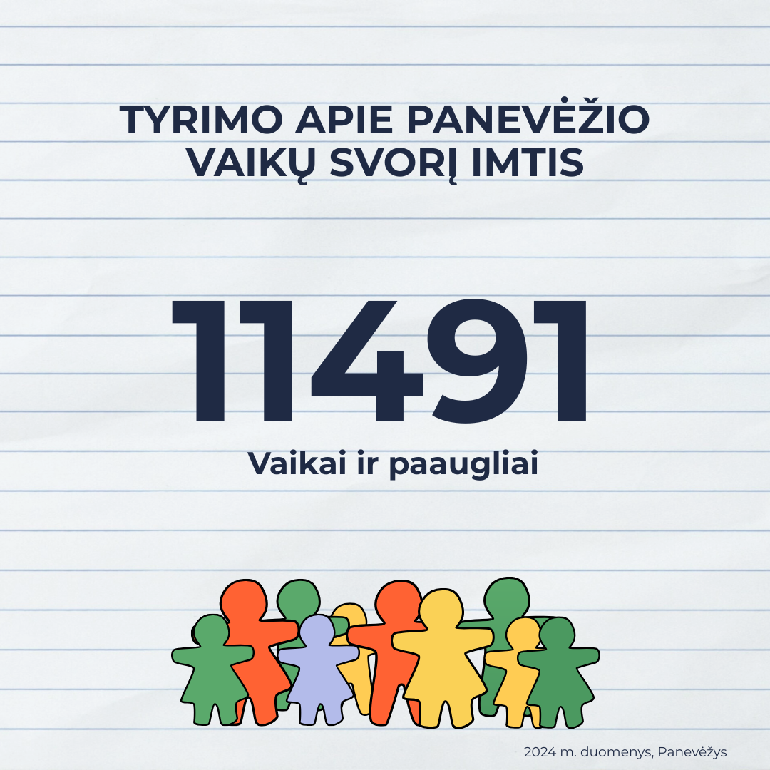 Tyrimo tikslas — nustatyti Panevėžio miesto savivaldybės vaikų ir paauglių nuo 2 iki 18 metų svorio pokyčius per 2019–2024 metų laikotarpį, palyginti rezultatus su Lietuvos ir Europos Sąjungos rodikliais ir pasiūlyti galimas antsvorio bei nutukimo prevencijos priemones.