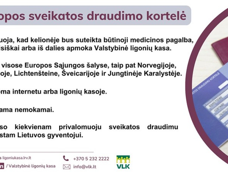 „Planuodami kelionę dažniausiai daug dėmesio skiriame maršrutui, apgyvendinimui ar laisvalaikiui, tačiau ne mažiau svarbu iš anksto pasirūpinti ir savo sveikatos saugumu. Net ir trumpų išvykų metu gali nutikti nenumatytų situacijų – prireikti medikų pagalbos staiga susirgus, patyrus traumą ar paūmėjus lėtinei ligai. Tokiais atvejais Europos sveikatos draudimo kortelė garantuoja, kad būtinoji medicinos pagalba keliautojui bus suteikta sklandžiai ir be finansinių nuostolių“, – sako Dalia Miniauskienė, Valstybinės ligonių kasos (VLK) Gyventojų aptarnavimo departamento direktorė.