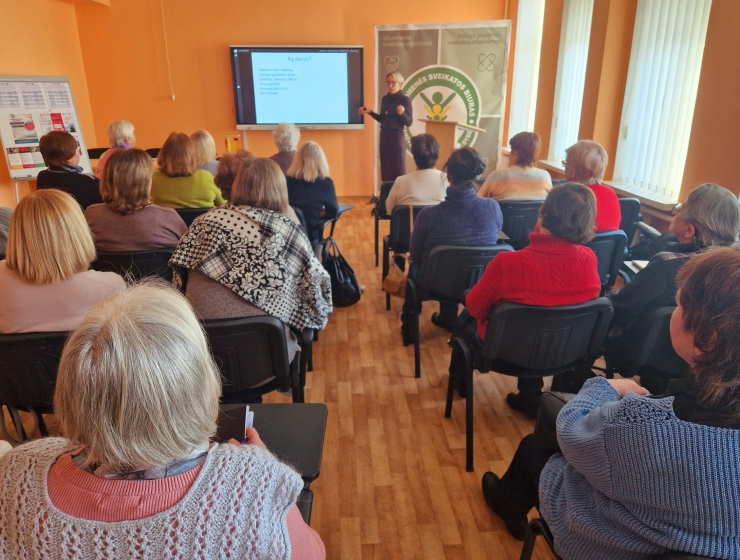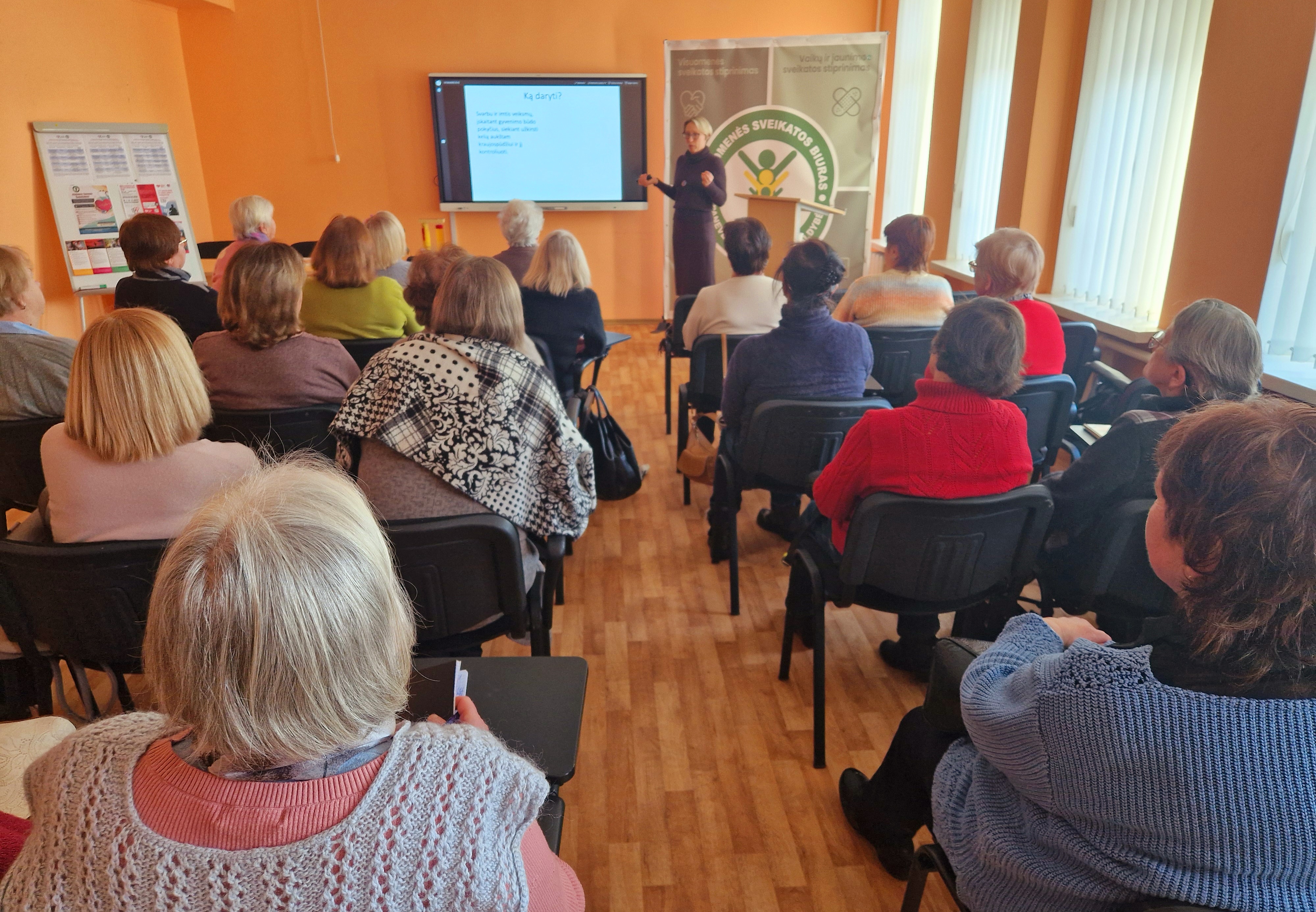Susitikimo metu gydytoja pristatė pagrindinius šių ligų rizikos veiksnius, aptarė prevencijos svarbą, paaiškino svarbiausių sveikatos rodiklių reikšmę ir jų stebėjimo naudą. Dalyviai aktyviai įsitraukė į diskusiją – buvo kalbama apie vaistų ir maisto papildų vartojimą, kasdienės gyvensenos įtaką sveikatai, užduota daug aktualių klausimų.